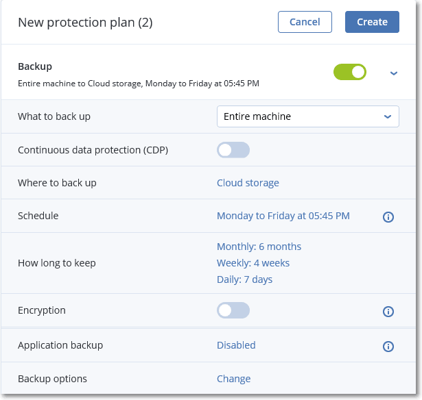 Se mostrarán los planes de protección que están aplicados al equipo. Si no hay ningún plan de protección asignado al equipo todavía, verá el plan de protección predeterminado que se puede aplicar. Puede cambiar la configuración según sea necesario y aplicar este plan, o crear uno nuevo.